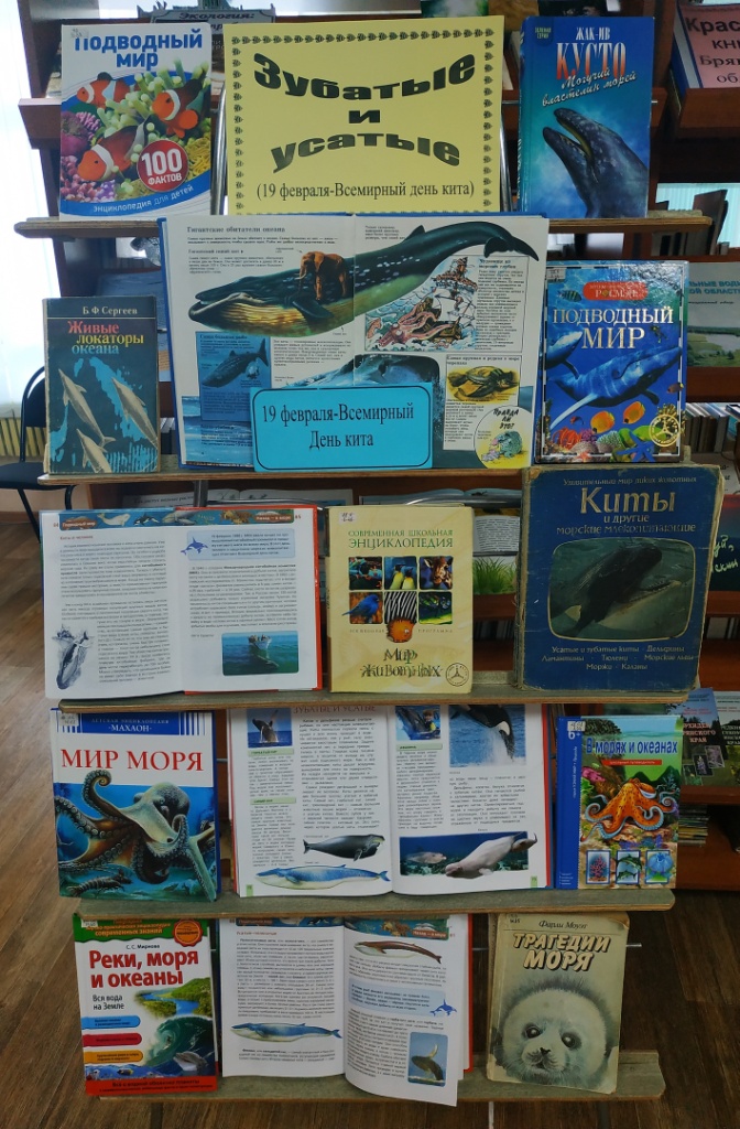 В нашей библиотеке есть много книг, иллюстрированных яркими картинками и фотографиями и рассказывающих об этих удивительных животных. Об их поведении, миграции, кормлении, а также о безжалостном истреблении морских гигантов браконьерами. Они представлены на выставке «Зубатые и усатые».