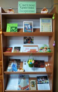 К этому дню в библиотеке оформлена книжная выставка «Светлое Христово Воскресение». Представленные на ней книги рассказывают об истории праздника, о том, как праздновали Пасху в старину на Руси, как подготовиться к празднику, какие блюда приготовить, как украсить пасхальные яйца.