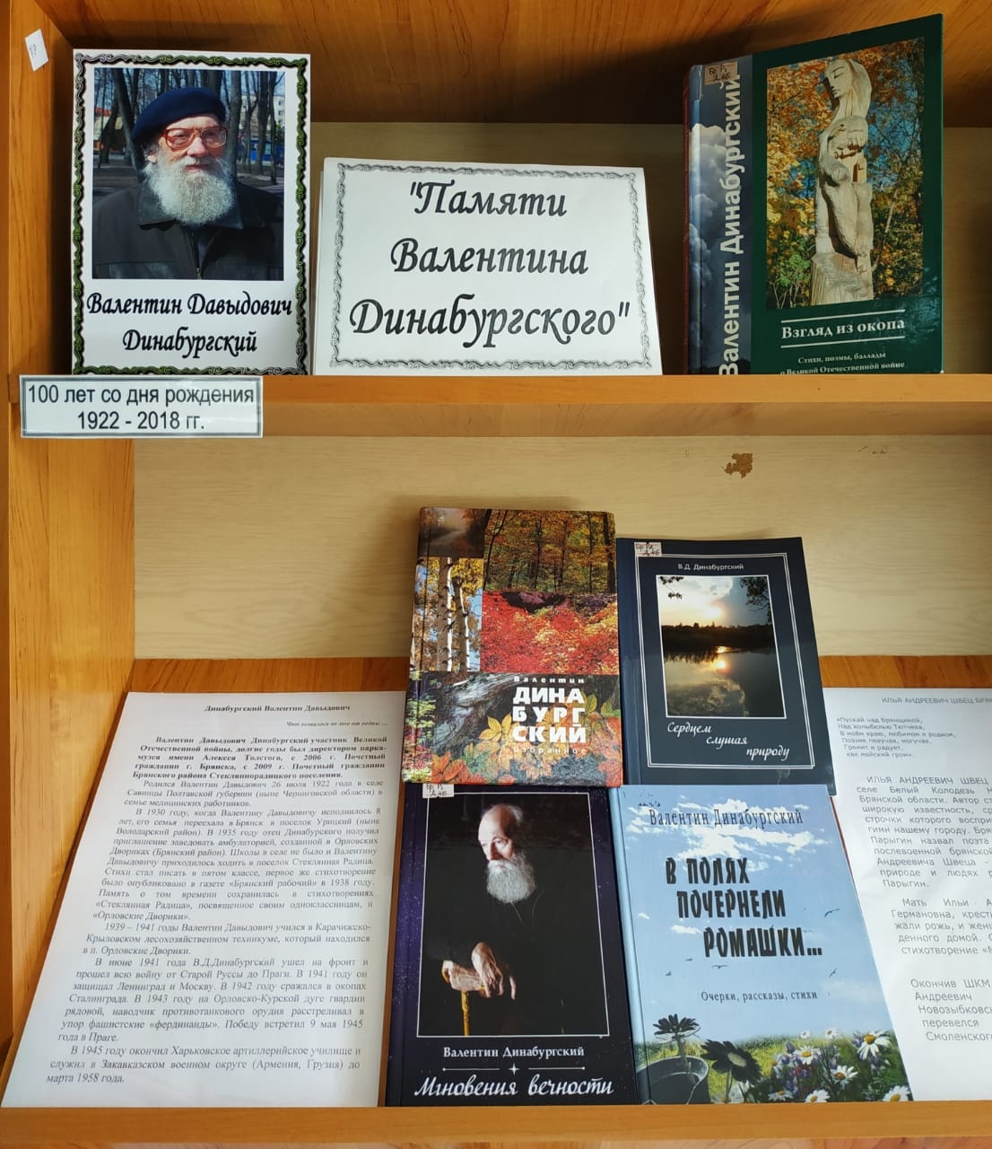 К юбилею поэта в Межпоселенческой библиотеке организована выставка «Памяти Валентина Динабургского». Читатели смогут познакомиться с его биографией и творчеством.