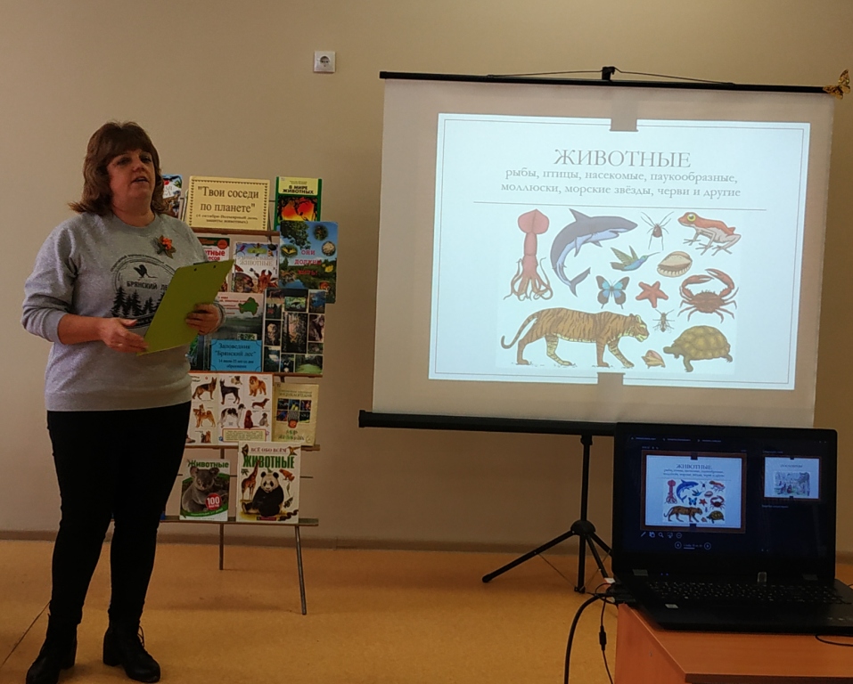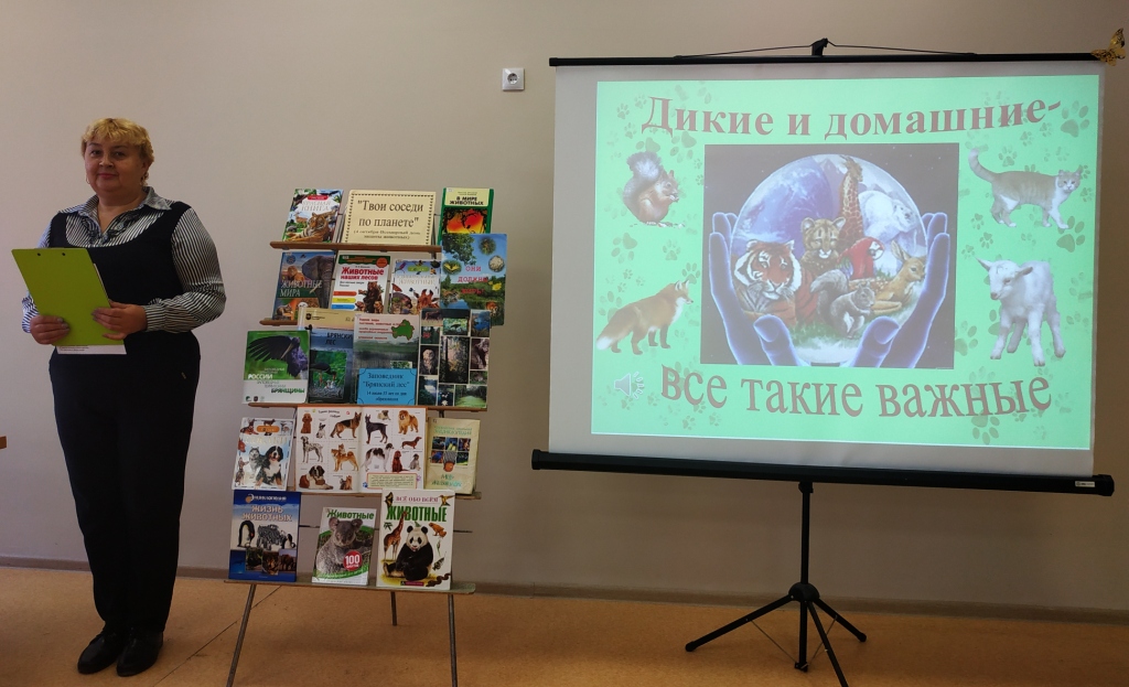 Сотрудники Межпоселенческой библиотеки совместно со специалистом отдела экологического просвещения заповедника “Брянский лес” В.И.Бабаниной для учащихся Навлинской основной школы им. М.Дунаевой провели мероприятие «Дикие и домашние – все такие важные», посвященное Всемирному дню защиты животных.