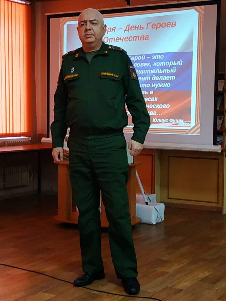 В Межпоселенческой библиотеке прошел час патриотизма, посвященный Дню Героев Отечества. Библиотекари рассказали школьникам об истории праздника, о великих полководцах прошлых времен и героях сегодняшнего дня. В мероприятии приняли участие: глава администрации Навлинского района А.Прудник, врио военного комиссара Навлинского района С. Погодин, председатель Брянской региональной общественной организации “Поисковый отряд “Поколение” п. Навля” Л. Середин, Благочинный Навлинского церковного округа иерей Т. Учватов, председатель районного Совета ветеранов войны, труда, Вооруженных Сил и правоохранительных органов Н. Колобаев.