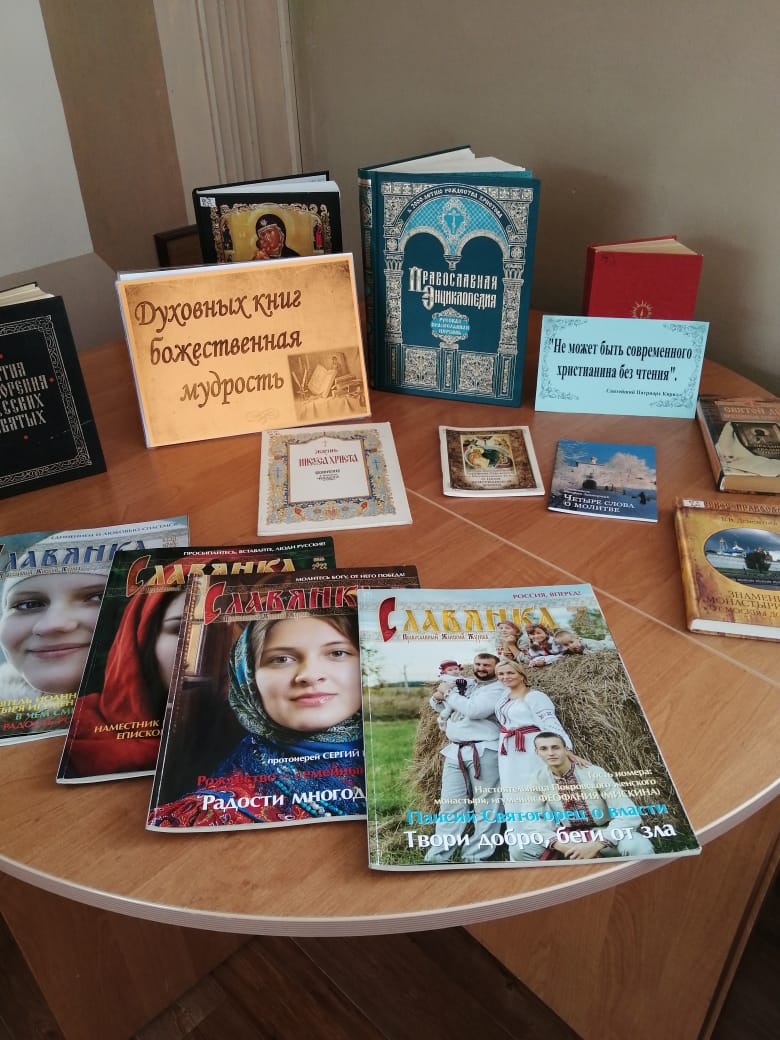 К этому празднику в Навлинской межпоселенческой библиотеке для читателей организована выставка «Духовных книг божественная мудрость». На ней представлены книги об истории и основах православия, православных праздниках и русском христианском искусстве, о православных святых и их жизни.