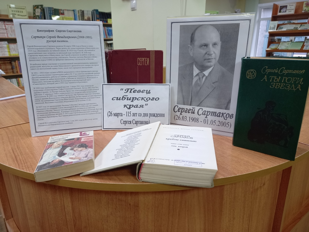 К юбилею писателя в нашей библиотеке оформлена выставка “Певец сибирского края” .
