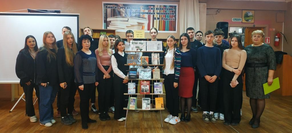 Минутой молчания школьники почтили память всех, кто погиб во время Великой Отечественной войны. В завершении мероприятия ребята познакомились с литературой, представленной на выставке «Жестокая правда войны».