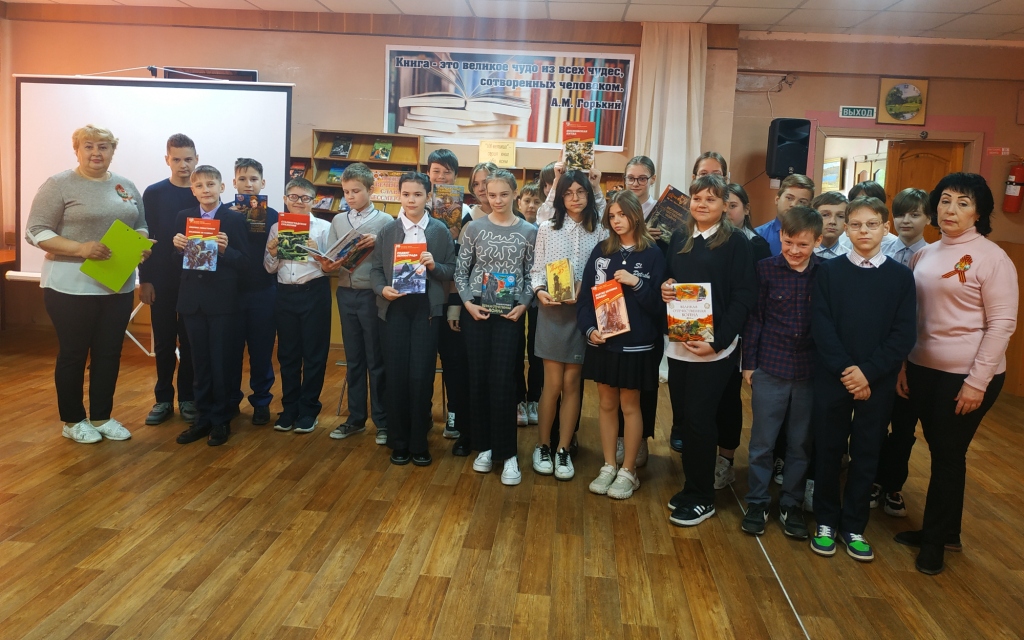 Учащиеся с удовольствием рассказали о героях своей семьи, воевавших на фронте и в партизанских отрядах. Присутствующие почтили минутой молчания память тех, кто отдал свои жизни в годы войны. В ходе мероприятия звучали стихи и песни великой Победы, были показаны видеоклипы о сражениях в ВОВ. Мальчишки и девчонки правильно ответили на непростые вопросы викторины. Большой интерес у них вызвала книжная выставка «Подвигу – вечность. Славе – бессмертие». В заключение встречи ребята все вместе спели песню «Пусть всегда будет солнце!».