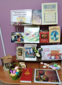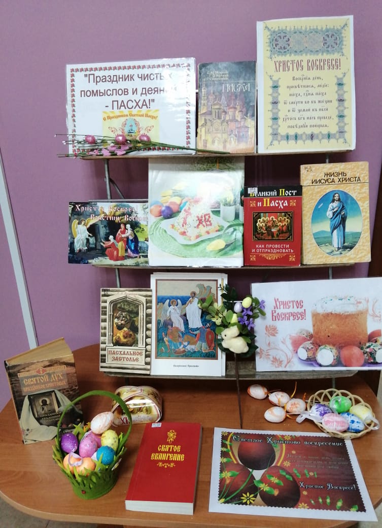 В преддверии Великого праздника в библиотеке организована выставка литературы «Праздник чистых помыслов и деяний – Пасха». На ней представлены книги и журналы об истории и традициях праздника, о том, как к нему подготовиться, как украсить пасхальные яйца и приготовить пасхальный кулич.