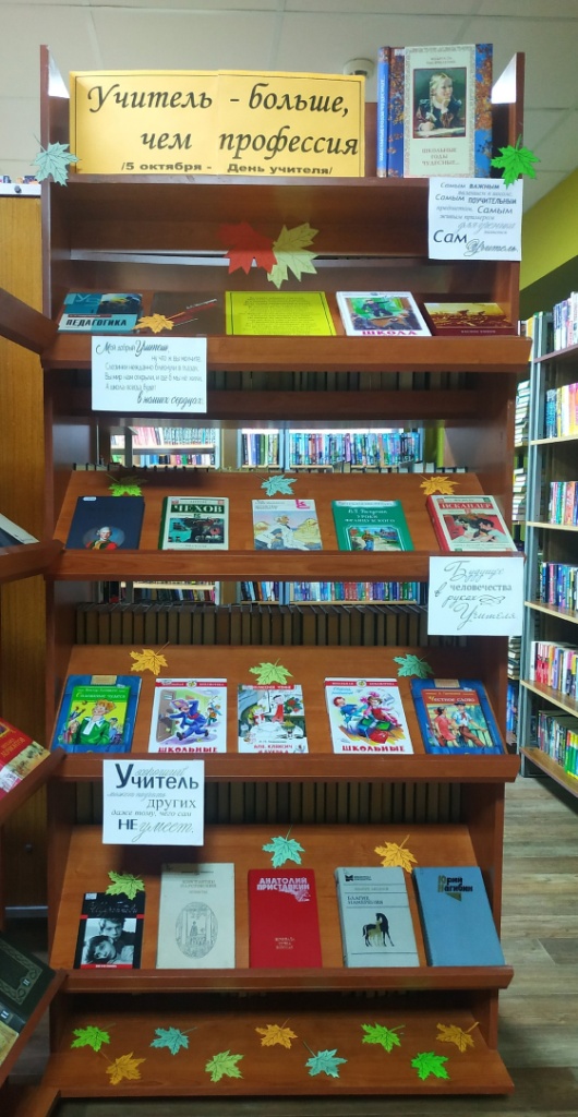 На выставке представлены художественные произведения русских и советских авторов о школе, учениках и личности учителя: А.С. Макаренко «Педагогическая поэма», В.Г. Распутина «Уроки французского», А.П. Гайдара «Школа» и другие. Большой интерес для читателей будет представлять издание «Школьные годы чудесные…». Эта книга афоризмов и крылатых выражений наполнена самыми добрыми, самыми искренними воспоминаниями о беззаботном школьном детстве.