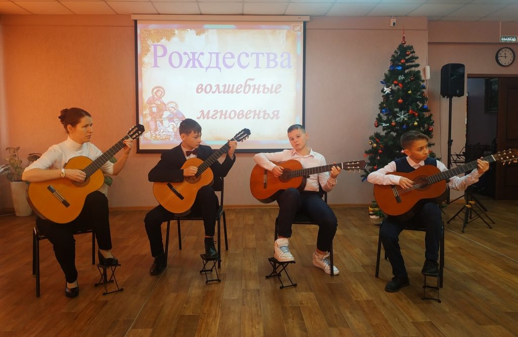 Гости познакомились с народными обрядами и православными традициями этого праздника и посмотрели видеоролики «История Рождества» и «Колядки на Рождество». Настоящим подарком было исполнение рождественских музыкальных композиций учащимися детской школы искусств, преподаватель Мосина Н.В.