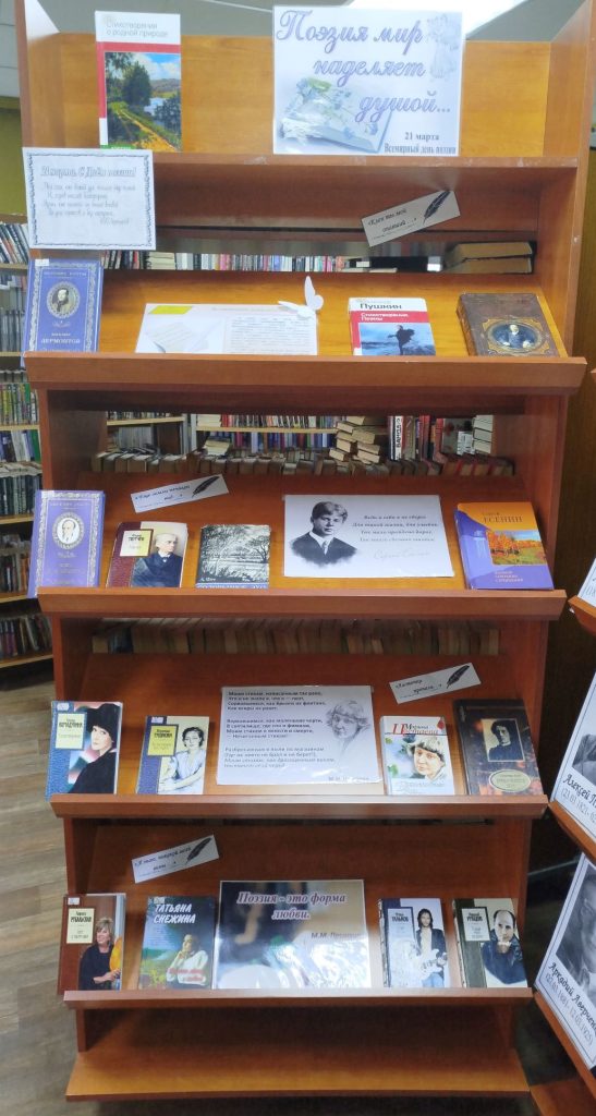 21 марта отмечается Всемирный день поэзии. Этот праздник – отличный повод вспомнить о выдающихся поэтах, открыть сборник стихотворений любимого автора и прочитать любимые строки. К этому дню в Навлинской библиотеке оформлена книжная выставка «Поэзия мир наделяет душой…».