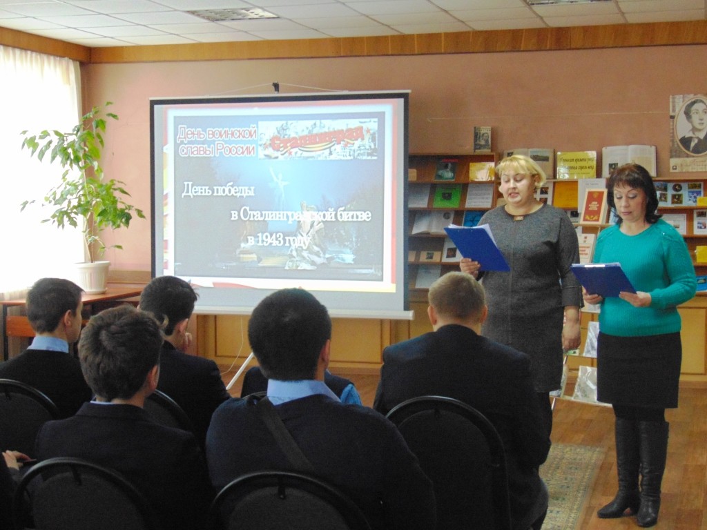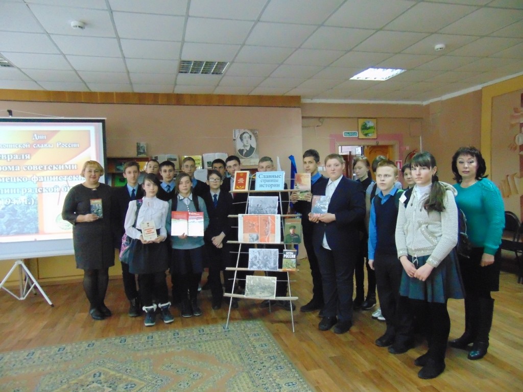 В этот день в Межпоселенческой библиотеке прошел час истории «Сталинградская битва – символ славы и бессмертия», для учащихся 7-х и 9-х классов Навлинской СОШ№1. Ведущие рассказали о Сталинградской битве 1942-1943 годов и разгроме немецко-фашистских войск на Волге. Ребята узнали о цене этой Победы, о героях Сталинградской битвы: сержанте Якове Павлове, снайпере В.Г. Зайцеве, морском пехотинце М.Паникахе, жителях, защищавших родной город. Особенно интересно школьникам было узнать, что в нашем поселке живет ветеран Великой Отечественной войны, участник Сталинградской битвы И.С. Яковин. Иван Сергеевич за мужество и героизм награждён медалью «За оборону Сталинграда».