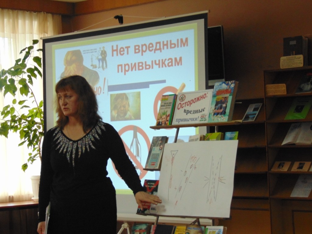 Одним из важных направлений работы Межпоселенческой библиотеки является пропаганда здорового образа жизни. Алкоголизм, курение, наркомания наносят непоправимый вред здоровью подрастающего поколения. Урок здоровья «Мы говорим здоровью: «Да!», проведенный с учащимися 7 «А» класса Навлинской СОШ № 2, был посвящен профилактике вредных привычек. Ведущие рассказали о влиянии алкоголя, наркотиков и табака на молодой растущий организм, напомнили ребятам о том, что нужно с детства думать и заботиться о своём здоровье, вести здоровый образ жизни и всегда говорить “НЕТ!” вредным привычкам.