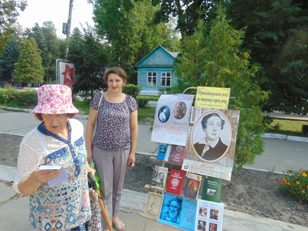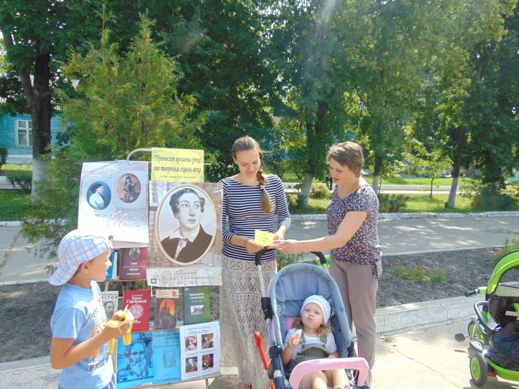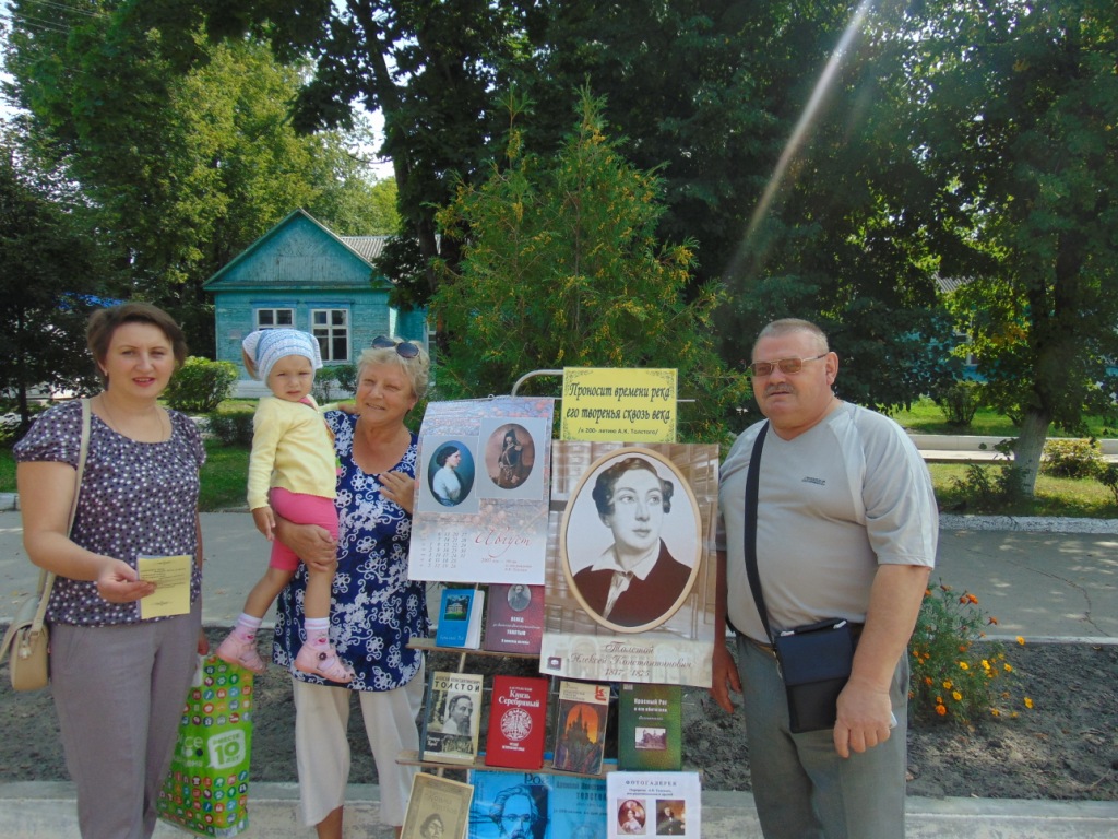 иближающимся 200-летием со дня рождения А.К.Толстого, 22 августа сотрудники Межпоселенческой библиотеки провели акцию на улицах поселка «Благословляю вас, леса». Для жителей была предоставлена информация о жизни и творчестве поэта, его связи с Брянщиной. Звучали стихи Толстого о природе, о любви, о родном крае. Представленная выставка стала интересной для людей разных возрастных категорий. Всем участникам акции раздавались буклеты о жизни и творчестве Толстого, с его поэтическими произведениями.