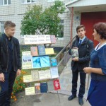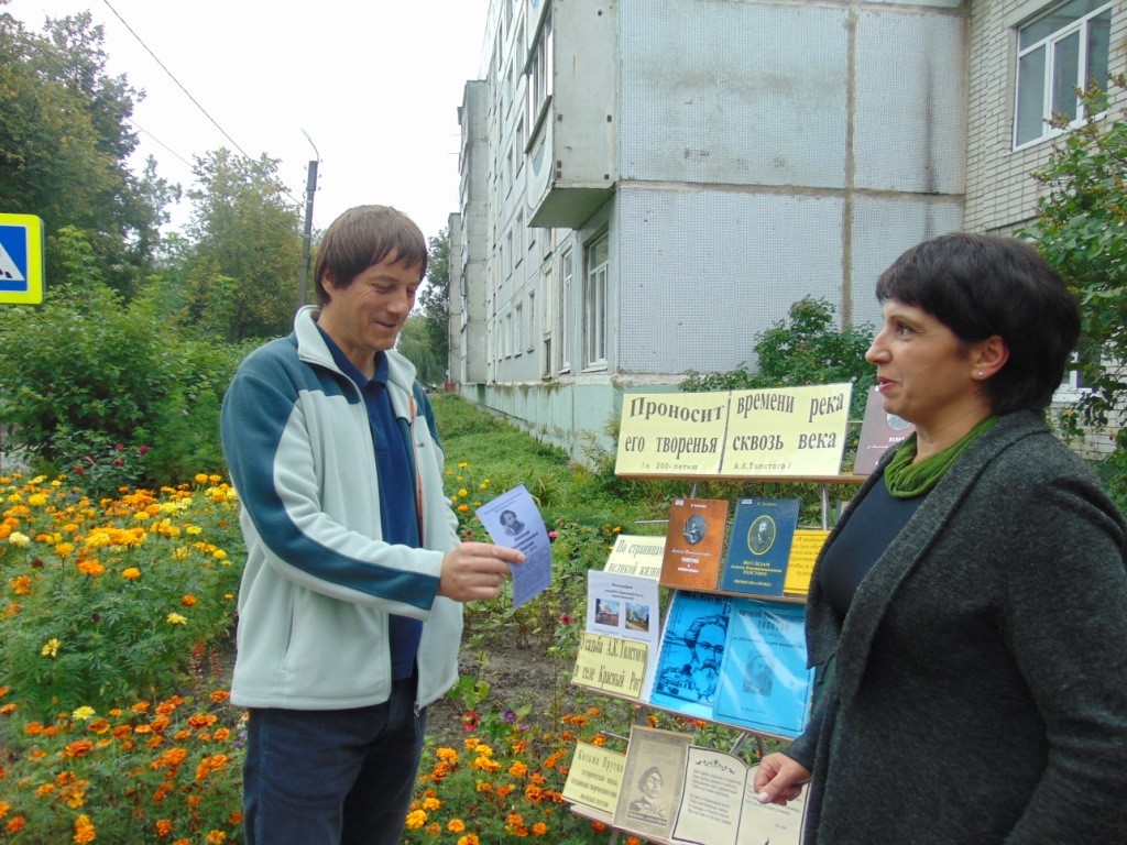 В 12 часов на улице перед библиотекой прошла акция «Сердце полно вдохновенья». В аудиозаписи звучали стихи А.К. Толстого в исполнении российских актеров и романсы на стихи поэта «Средь шумного бала», «Колокольчики » и др. Сотрудники библиотеки знакомили с информацией о Толстом, раздавали закладки и буклеты «Толстой – неисчерпаемый источник для музыки» и «Знаменитые высказывания Козьмы Пруткова, подготовленные к юбилею поэта.