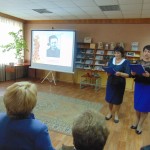 Первая часть мероприятия была посвящена интересным людям, известным всей стране – композитору А.Н. Пахмутовой и поэту Н.Н. Добронравову, прожившим вместе более полувека и подарившим людям огромный ряд замечательных и всеми любимых песен. Рассказ ведущих об этом талантливом творческом союзе сопровождался электронной презентацией, на экране мелькали фотографии Пахмутовой и Добронравова, звучали их песни: «Как молоды мы были», «Нежность», «До свиданья, Москва, до свиданья», «Беловежская пуща», «Мелодия» и др.
