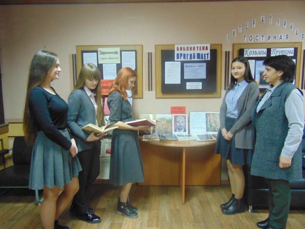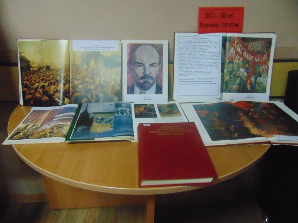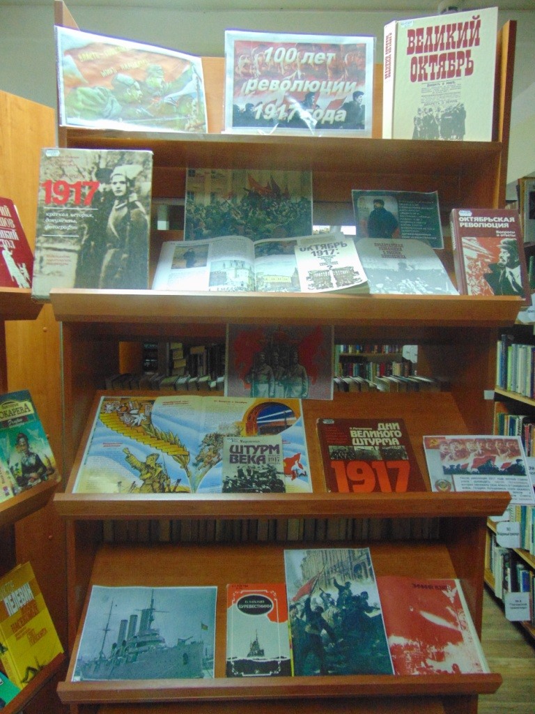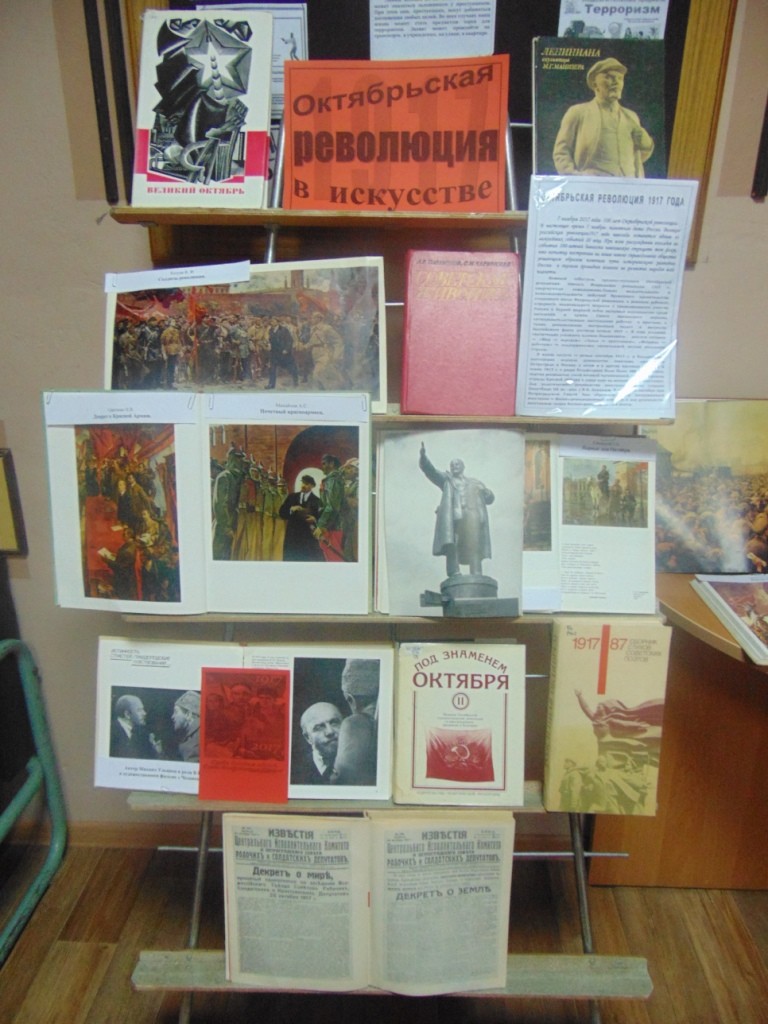 К этому дню в Межпоселенческой библиотеке были оформлены выставки литературы: «100 лет революции 1917 года» и «Октябрьская революция в искусстве». Сотрудники читального зала и абонемента провели тематические беседы с учащимися старших классов Навлинских СОШ №1 и №2 «Брянщина в годы Октябрьской революции» и «Октябрьская революция в искусстве».
