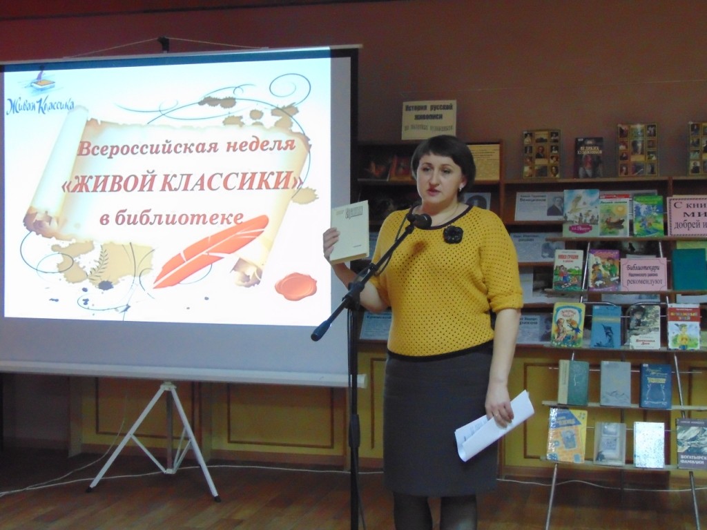 В этом году Межпоселенческая библиотека Навлинского района, как куратор муниципального этапа конкурса, приняла участие во Всероссийской неделе “Живой классики”. Сотрудники Межпоселенческой и детской библиотек отобрали литературу, не входящую в школьную программу, которую, по их мнению, нужно прочесть подросткам, и организовали выставку “С книгой мир добрей и ярче”.