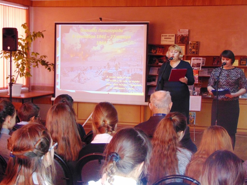 Мероприятие сопровождалось показом электронной презентации. Затаив дыхание, учащиеся посмотрели видеоролик «Блокадный Ленинград». Вниманию школьников была представлена выставка «Бессмертный подвиг Ленинграда».