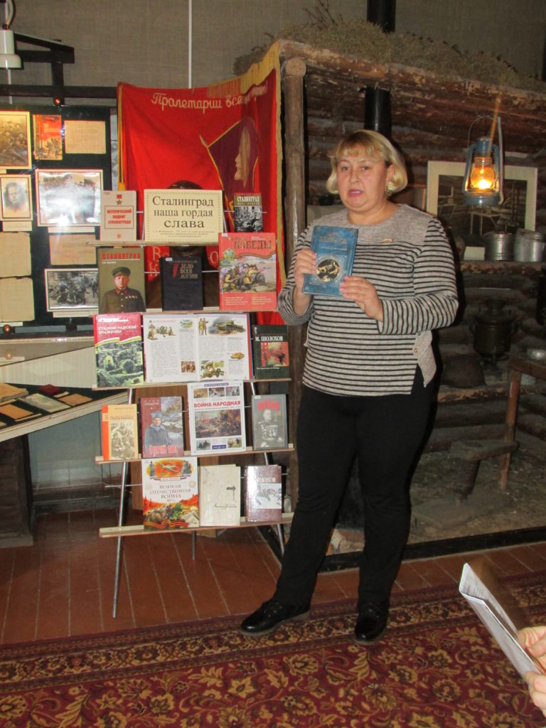 Сотрудники библиотеки познакомили с книжной выставкой «Сталинград – наша гордая слава», на которой были представлены мемуары маршалов Советского Союза: Г.К. Жукова, К. К. Рокосовского, А.М. Василевского, и художественные произведения: К. Симонов «Живые и мёртвые», В. Гроссман «За правое дело», М. Шолохов «Они сражались за Родину», С. Алексеев «Сталинградское сражение», Ю. Бондарев «Горячий снег» В. Некрасов «В окопах Сталинграда», Е. Ильина «Четвертая высота» и другие.
