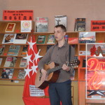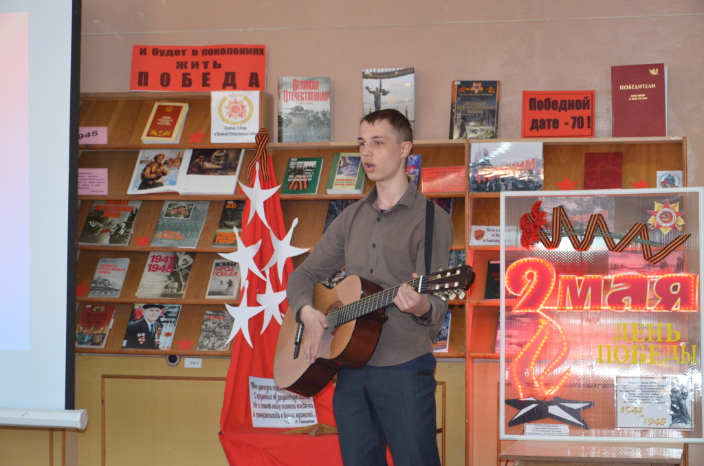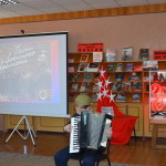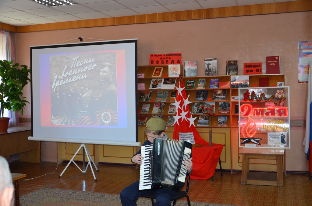 Учащиеся Навлинской детской школы искусств Пузанов Виктор, Максимов Артем, Осипенков Роман исполнили для ветеранов и гостей библиотеки военные песни «Темная ночь», «Синий платочек» и песню из кинофильма «Офицеры».