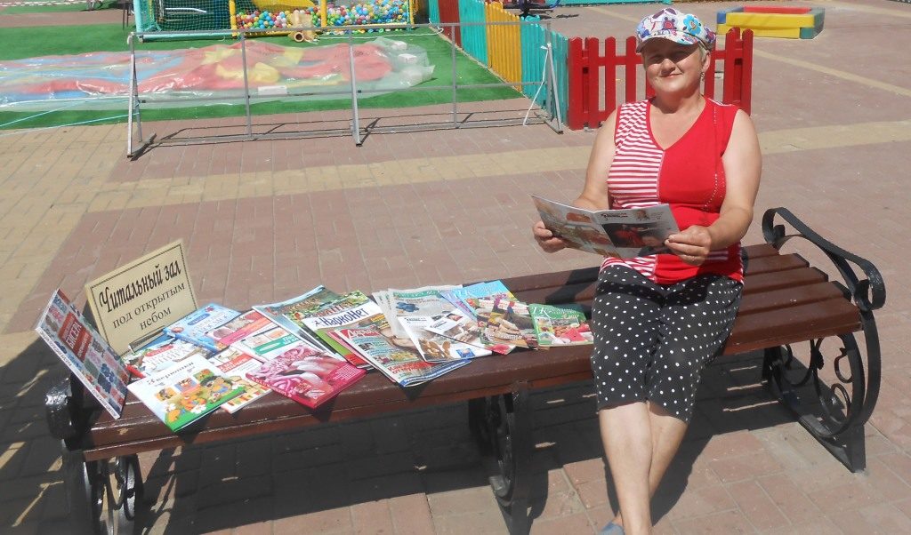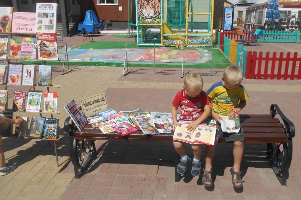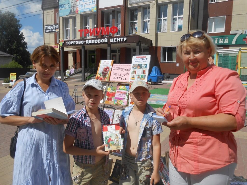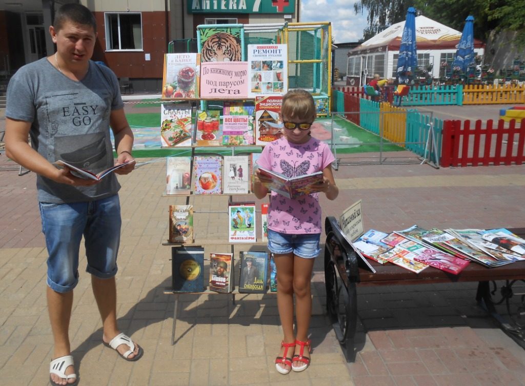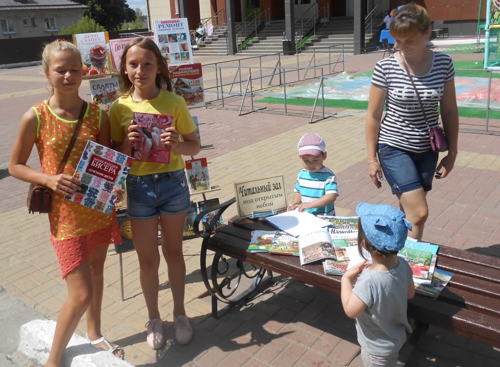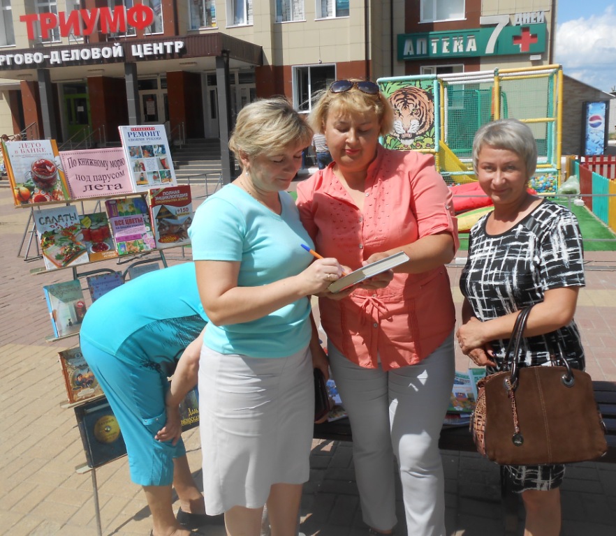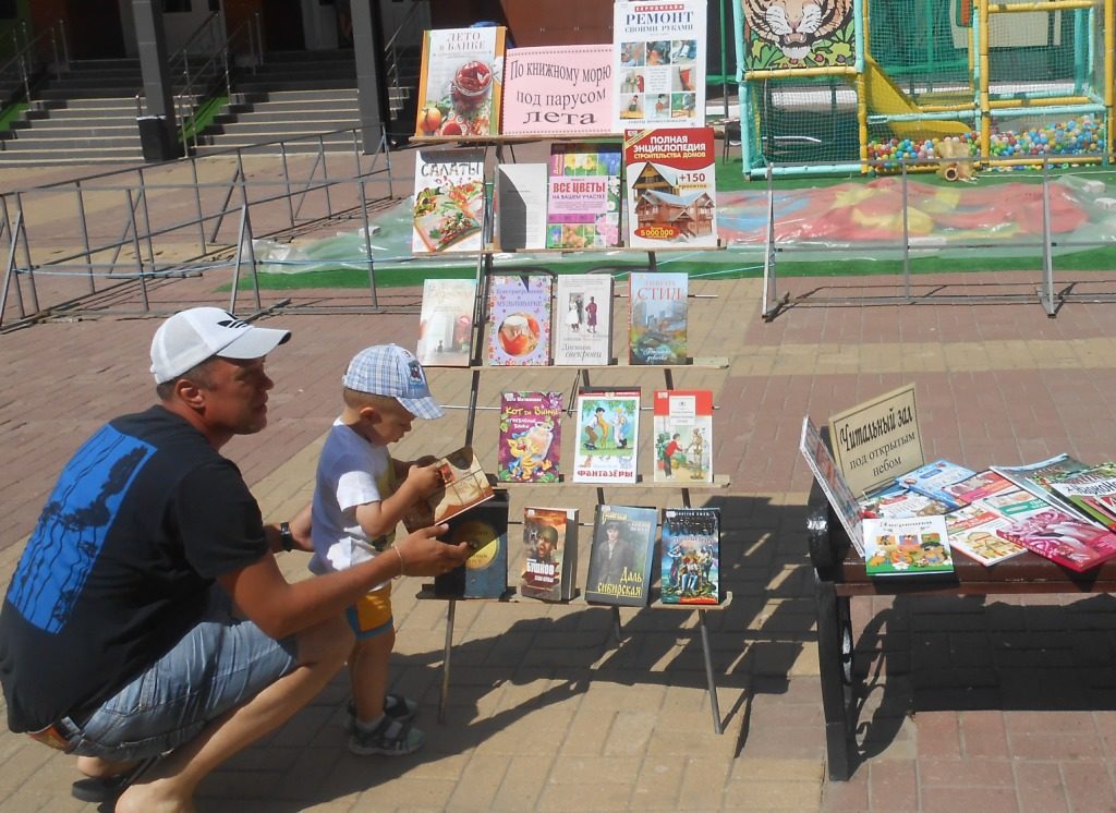 Сотрудники библиотеки провели очередную акцию «Читающая скамейка». Яркие книжные выставки «По книжному морю под парусом лета» и «Читальный зал под открытым небом» уютно расположились возле Торгово-делового центра «Триумф».