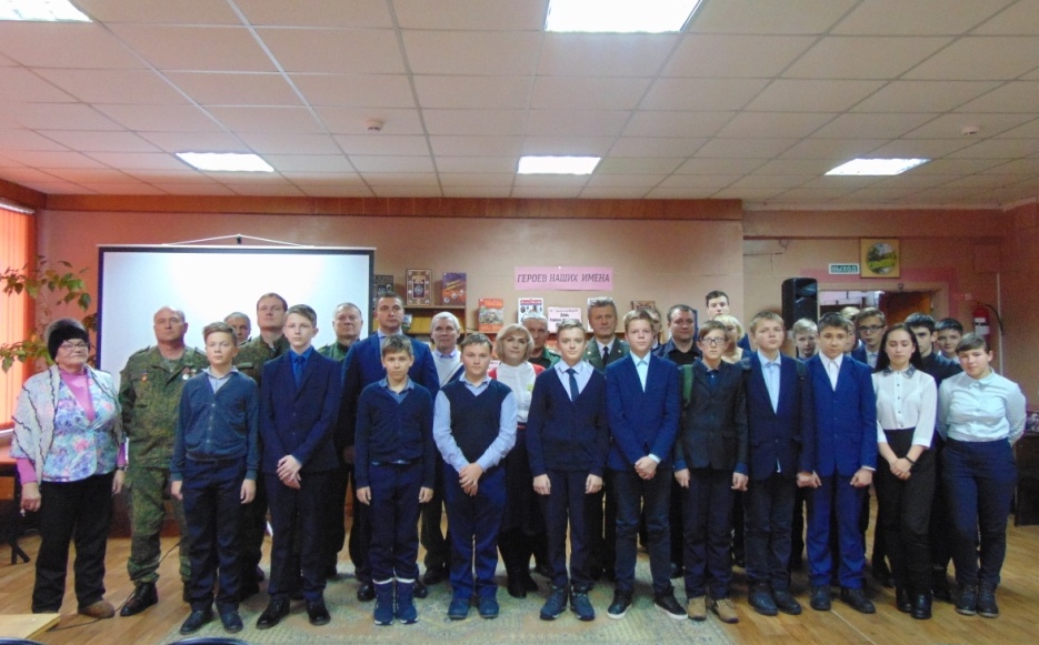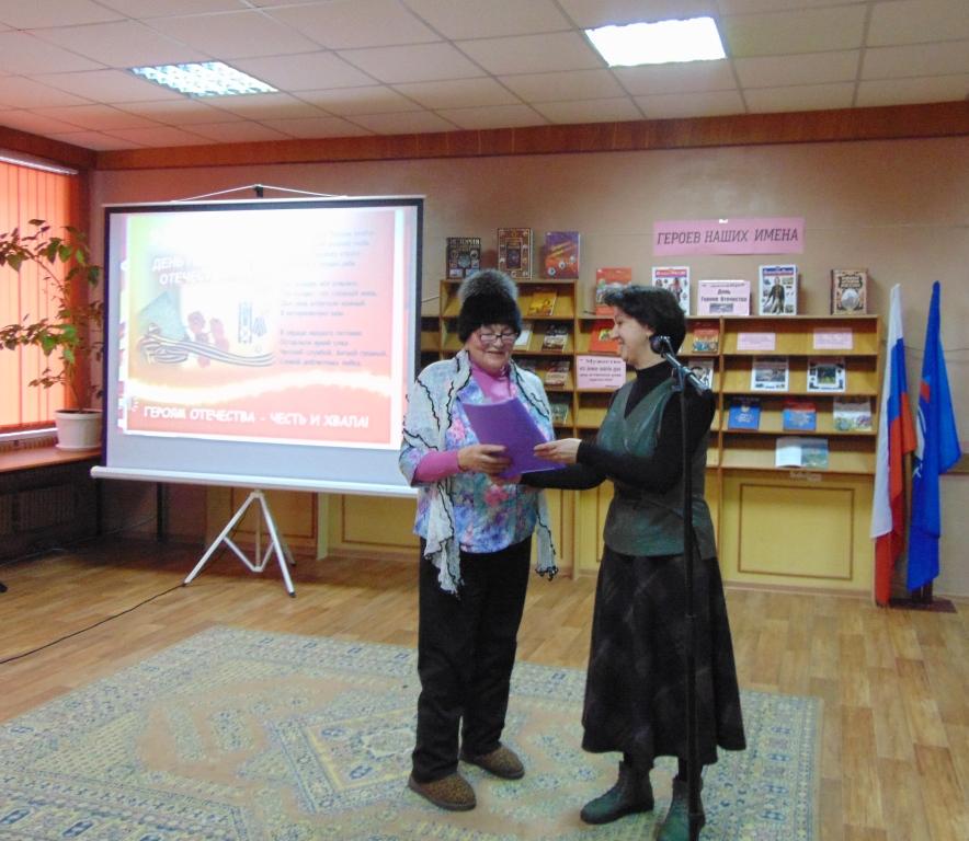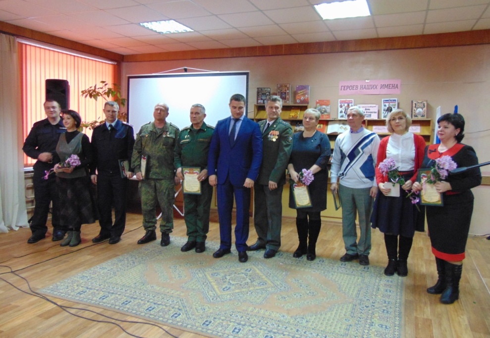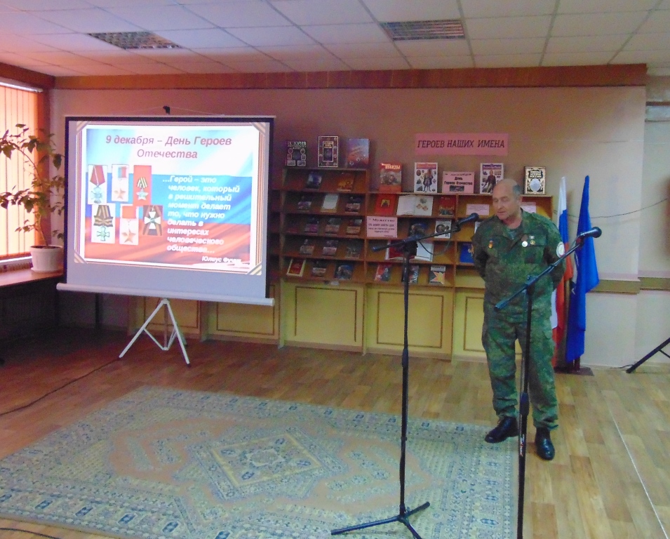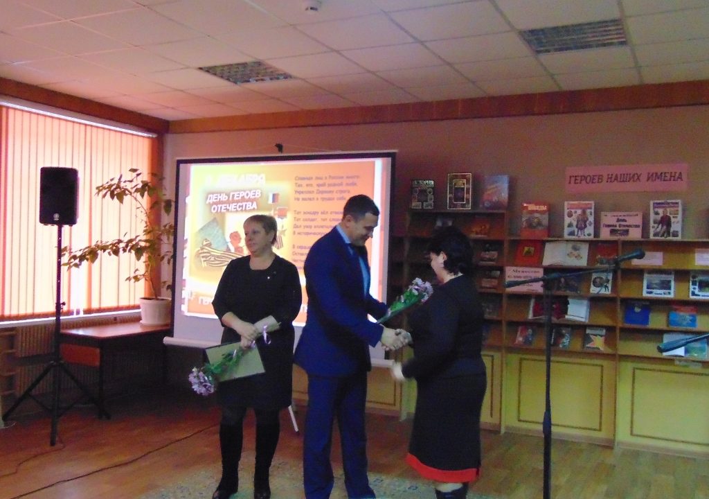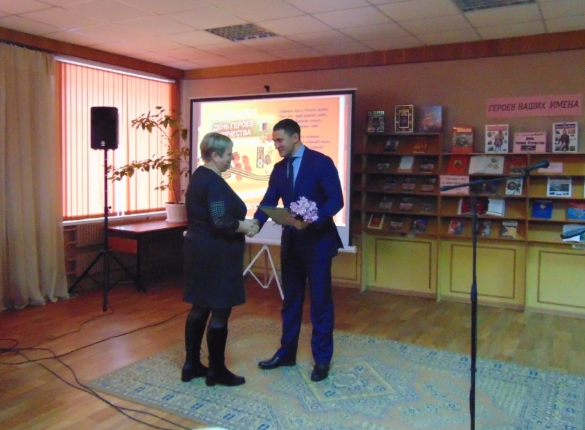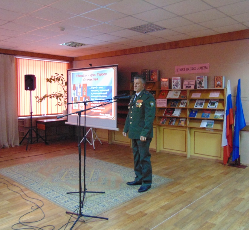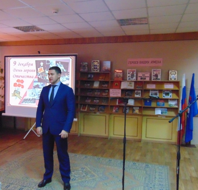 В преддверии памятной даты в Межпоселенческой библиотеке состоялось торжественное мероприятие, посвященное Дню Героев Отечества. В этот день в зале присутствовали: глава администрации Навлинского района А.А. Прудник, председатель районного отделения «Российский союз ветеранов Афганистана» А.В. Лошкарев, председатель районной общественной организации ветеранов Вооруженных сил А.М. Мокров, Р.Н. Грачев и А.Н. Чистяков, выполнившие свой воинский долг в Чеченской Республике, члены поискового отряда «Поколение», руководители учреждений района, молодежь, жители поселка.
