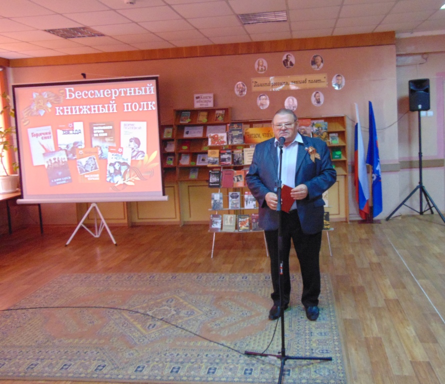 Начальник отдела по культуре, молодежной политике и спорту администрации Навлинского района Л. А. Калинченкова, директор Межпоселенческой библиотеки О.В Прохоренко, председатель районного Совета ветеранов войны, труда, вооруженных сил и правоохранительных органов Н.П. Колобаев обращаясь к молодежи, подчеркнули важную роль книг о войне в сохранении исторической памяти и призвали всегда помнить о подвигах наших дедов и прадедов, о том , какой ценой досталась нам Победа. Самая юная участница акции “Бессмертный книжный полк” Мирослава Серегина прочитала стихотворение Георгия Рублева «Это было в мае, на рассвете».