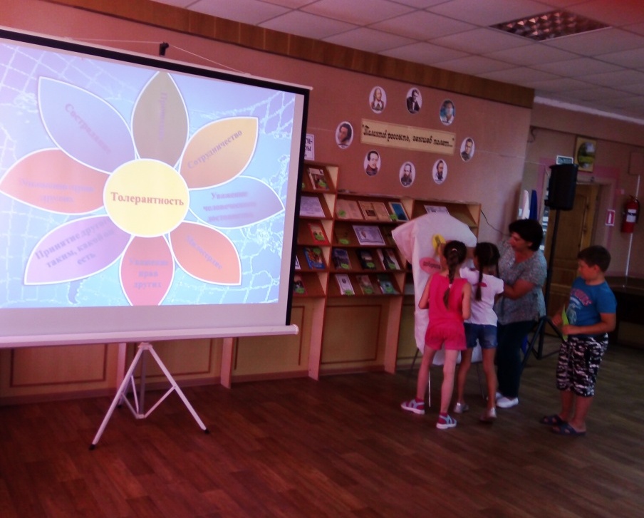 Для мальчишек и девчонок, посещающих летний лагерь Навлинской СОШ №2, сотрудники Межпоселенческой библиотеки провели урок толерантности «Путешествие в страну Толерантность». С помощью электронной презентации школьники посетили город Добро, «искупались» в озере Улыбки, прогулялись по улице Пожалуйста, побывали в городе Волшебных слов.
