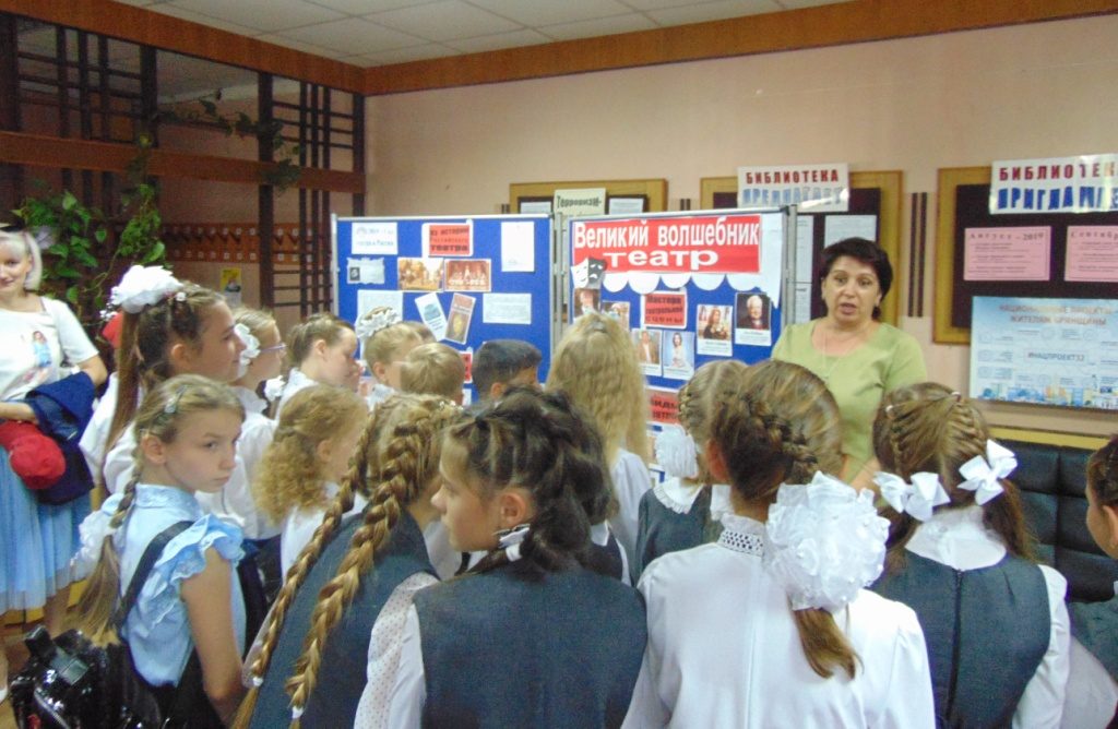С помощью электронной презентации школьники смогли «посетить» знаменитые театры России, такие, как Большой театр, театр «Современник», Мариинский театр, а также театр имени Вахтангова, который готовится отметить свой 100-летний юбилей.