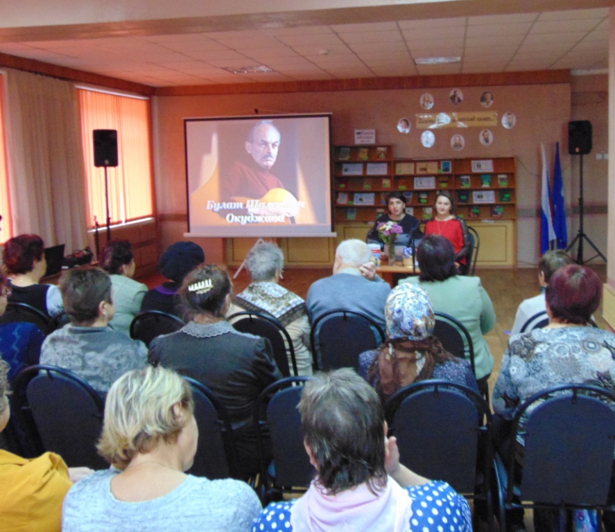 1 октября Межпоселенческая библиотека совместно с Комплексным центром социального обслуживания населения пригласила в гости людей, чей возраст называют золотым. Приятным подарком для всех собравшихся стала литературно-музыкальная гостиная, посвященная 95-летию Булата Окуджавы. Его стихи и песни близки людям старшего поколения. Мероприятие сопровождалось электронной презентацией о жизни и творчестве поэта и композитора, с экрана звучали любимые песни, созданные Окуджавой: «До свидания, мальчики», «Виноградная косточка», «Любовь и разлука», «Возьмемся за руки, друзья» и другие.