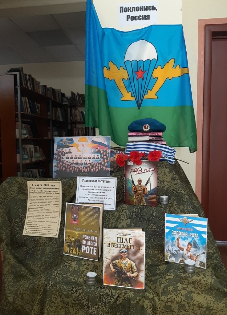 В память о подвиге десантников 6-й роты в Межпоселенческой библиотеке оформлена выставка – инсталляция, на которой представлена книга Олега Дементьева и Владимира Клевцова “Шаг в бессмертие” и сборники очерков о наших земляках, погибших в Чеченских войнах, “Ваши судьбы война протаранила…” и “Я обещал вернуться, мама…”