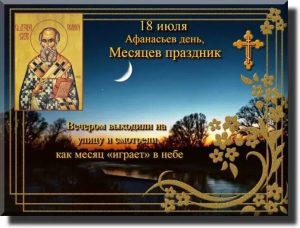 Народный праздник «Афанасьев день» отмечается 18 июля (по старому стилю – 5 июля). В церковном календаре день посвящен памяти преподобного Афанасия Афонского. Другие названия даты: «Афанасий», «Месяцев праздник», «Лунный праздник».