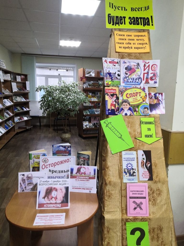 В преддверии Всемирного дня борьбы со СПИДом в Навлинской библиотеке оформлена книжная выставка «Пусть всегда будет завтра». На выставке представлены книги, периодические издания, буклеты, памятки, рассказывающие об истории возникновения Дня борьбы со СПИДом, о путях заражения СПИДом, признаках заболевания, методах борьбы с ним.
