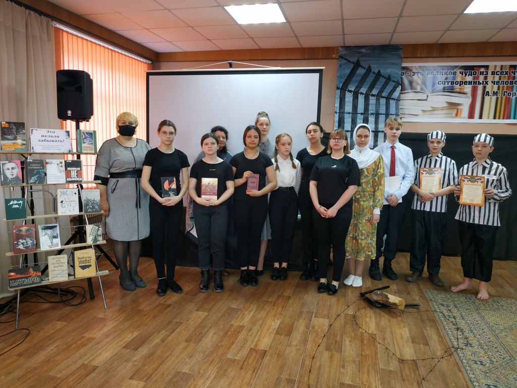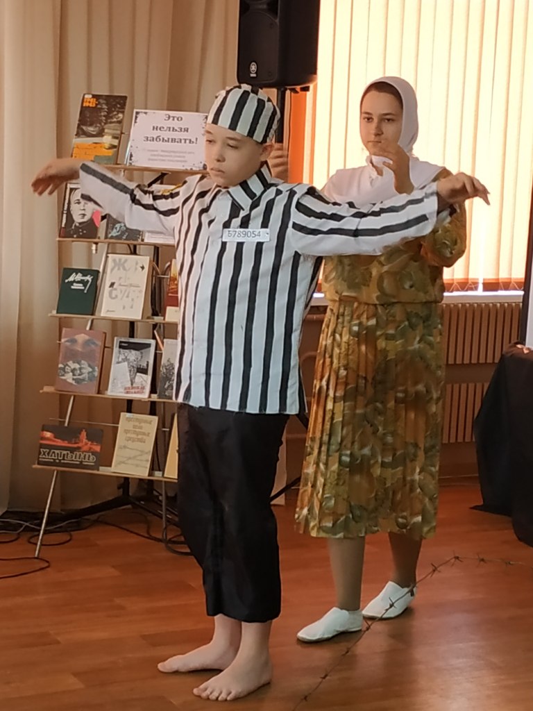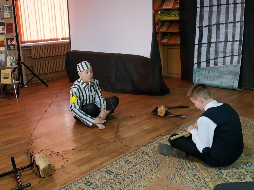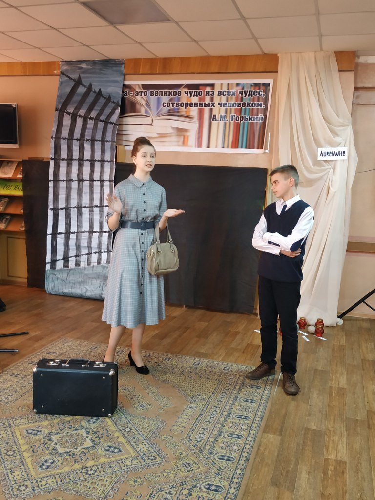 Юные актеры школьного театра «Лицедеи» (руководитель Т.В. Анисимова) очень эмоционально и проникновенно показали инсценированный отрывок из романа ирландского писателя Джона Бойда «Мальчик в полосатой пижаме». Это история о дружбе немецкого мальчика Бруно и его еврейского ровесника Шмуля, разделенных колючей проволокой. Очень разные, буквально живущие в параллельных мирах, дети, несмотря на все препоны, становятся друзьями вопреки обстоятельствам. Но завязавшаяся дружба, между мальчишками разного социального положения, неминуемо становится причиной трагических событий…