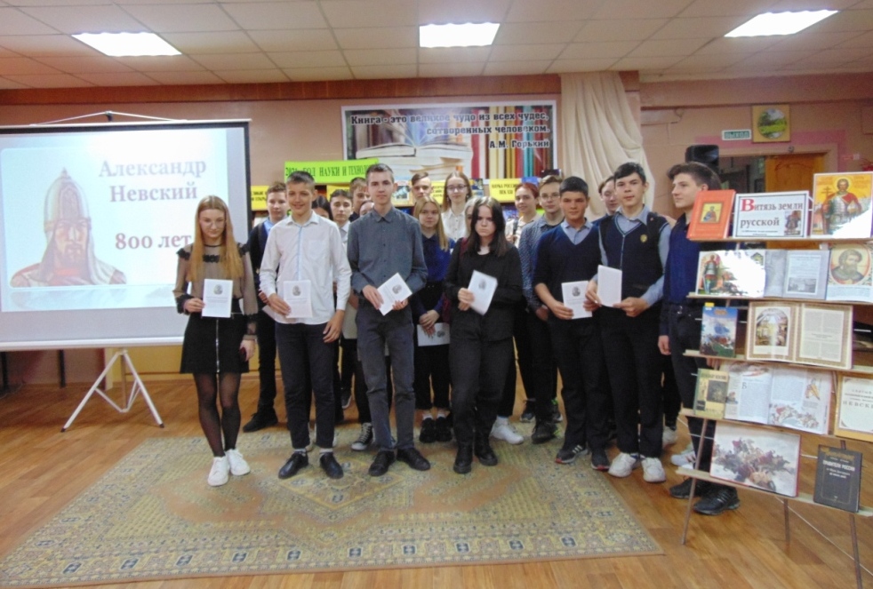 В Межпоселенческой библиотеке совместно с редакцией районной газеты «Наше время» состоялся час истории «Александр Невский. Подвиги за веру и Отечество». На мероприятии присутствовали учащиеся 8 класса Навлинской СОШ №2. Ребята внимательно и с неподдельным интересом слушали рассказ библиотекарей о жизни и боевых подвигах Александра Невского, с удовольствием смотрели отрывки из фильмов о великом русском полководце, правильно ответили на все вопросы викторины. В завершении встречи сотрудник районной газеты «Наше время» И. Бурцева обратилась к ребятам с пожеланиями, как можно больше читать книги о великих исторических личностях, знать историю России, любить свою Родину и защищать ее интересы. Затем она вручила школьникам буклеты с интересными фактами из биографии Александра Невского.