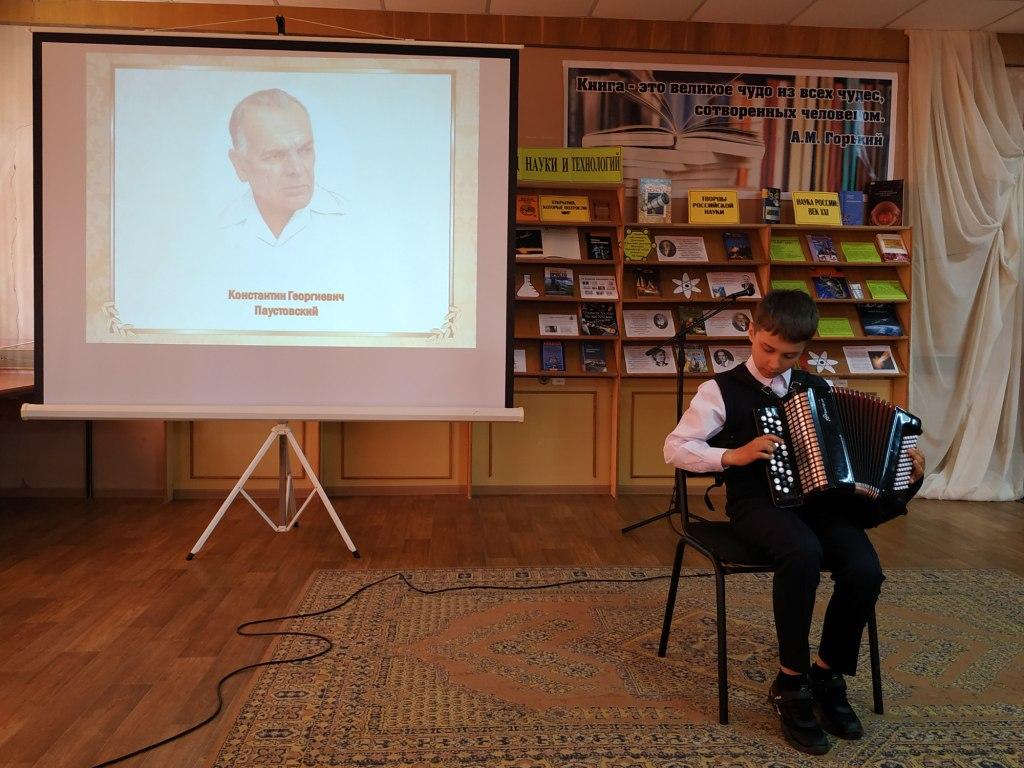 Сотрудники Межпоселенческой библиотеки пригласили молодежь и всех почитателей таланта К.Г. Паустовского в литературную гостиную «Путешествие в мир Паустовского». Библиотекари рассказали о жизни и творчестве писателя и предложили совершить виртуальное путешествие по местам, связанным с жизнью писателя. Юные чтецы, обучающиеся Навлинской СОШ №2, Мария Кондрашова и Никита Поздняков, прекрасно прочли отрывки из произведений Паустовского «Корзина с еловыми шишкам» и «Повесть о жизни». Воспитанники Навлинской детской школы искусств Анна Казанцева и Николай Ерохин порадовали присутствующих великолепной игрой на баяне.