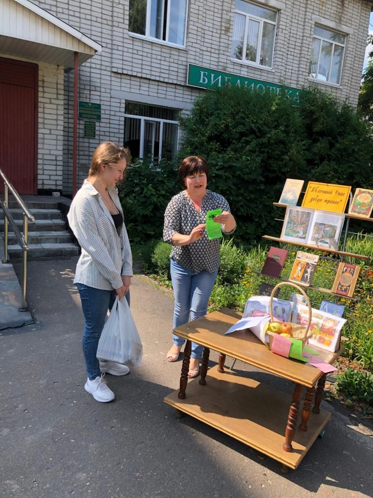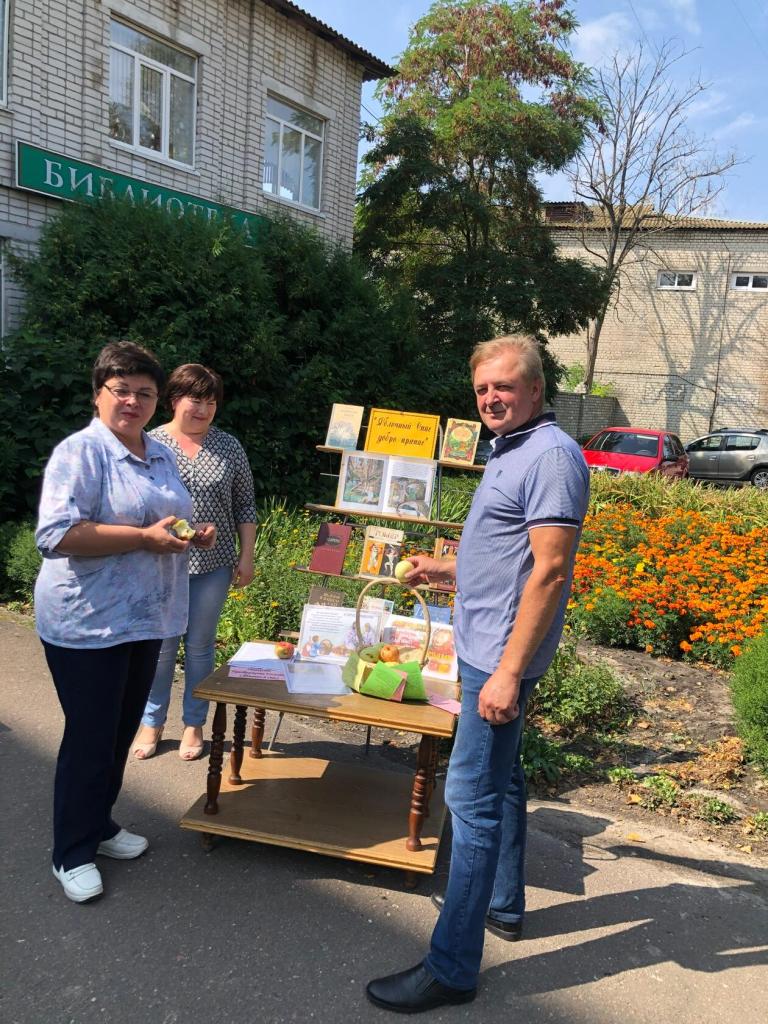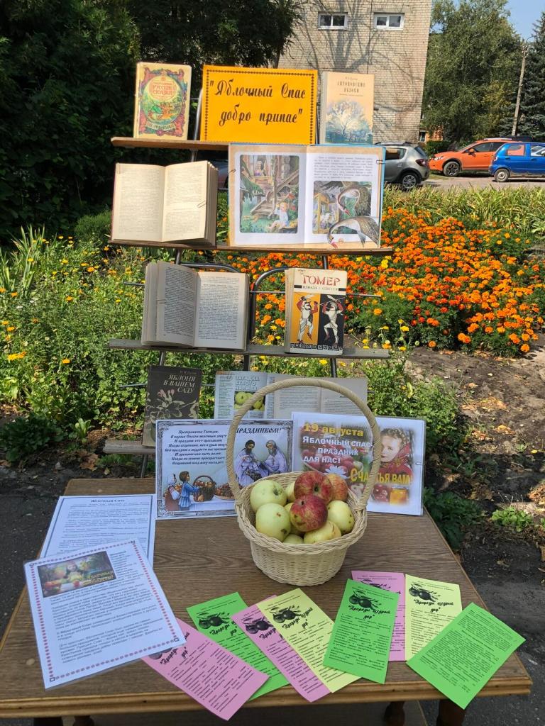 В этот день на площадке перед зданием Межпоселенческой библиотеки библиотекари организовали выставку-дегустацию “Яблочный Спас добро припас”. Посетители библиотеки и прохожие знакомились с книгами, в названии и содержании которых речь идет о яблоках: “Яблоки Гесперид” (“Мифы Древней Греции”), “Илиада” Гомера, русские народные сказки (“Гуси-лебеди”, “Сказка о молодильных яблоках и живой воде”), “Антоновские яблоки” И. Бунина, “Лето Господне” (глава “Яблочный Спас”) И. Шмелева и другие, делились своими “яблочными секретами” и рецептами блюд и заготовок, угощались спелыми ароматными яблоками.