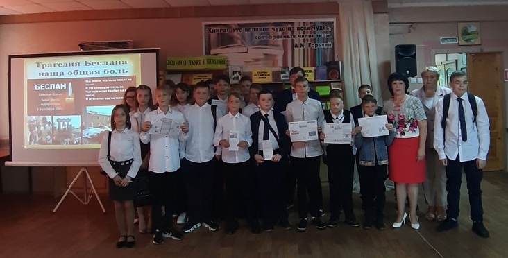 Сотрудники библиотеки познакомили школьников с трагическими событиями, семнадцатилетней давности. Ребята, узнали о крупных терактах XXI века, и о том какое зло, боль и слезы приносят террористы всему человечеству, и что можно сделать, чтобы избежать трагедии. Память всех жертв террора собравшиеся почтили минутой молчания.