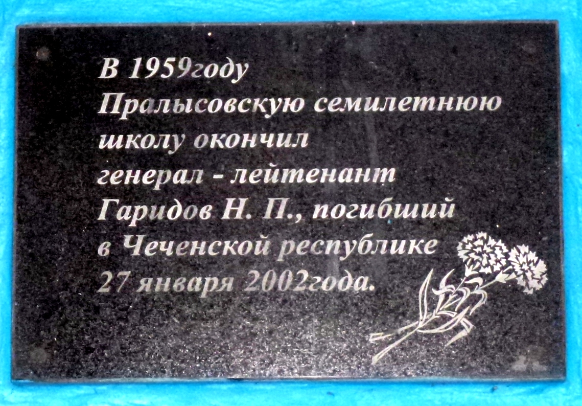 На здании Пролысовской средней школы установлена памятная доска в честь Гаридова Николая Петровича, генерал-лейтенанта, военачальника, отдавшего жизнь во имя территориальной целостности и сохранения конституционного строя России.