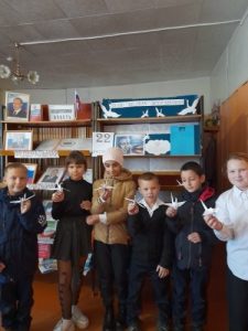 Мы постарались сделать бумажных белых журавликов в технике оригами на мастер-классе, который провела библиотекарь. А в завершение мероприятия прошла патриотическая акция, когда всех бумажных белых журавликов мы подарили жителям села