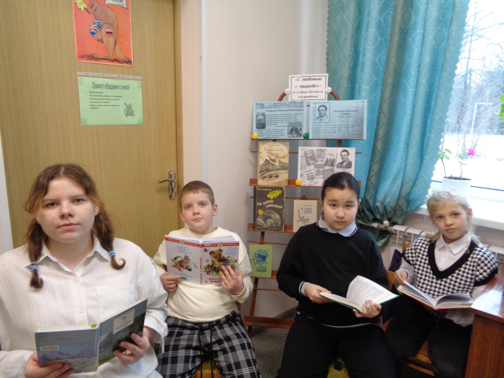 К 105-летию со дня рождения детского писателя Н.И. Сладкова в Щегловской библиотеке прошли громкие чтения “С любовью к природе”. Школьники познакомились с биографией писателя, читали рассказы “Дятел”, “Как переворачивали медведя”. К этой дате в библиотеке оформлена книжная выставка.