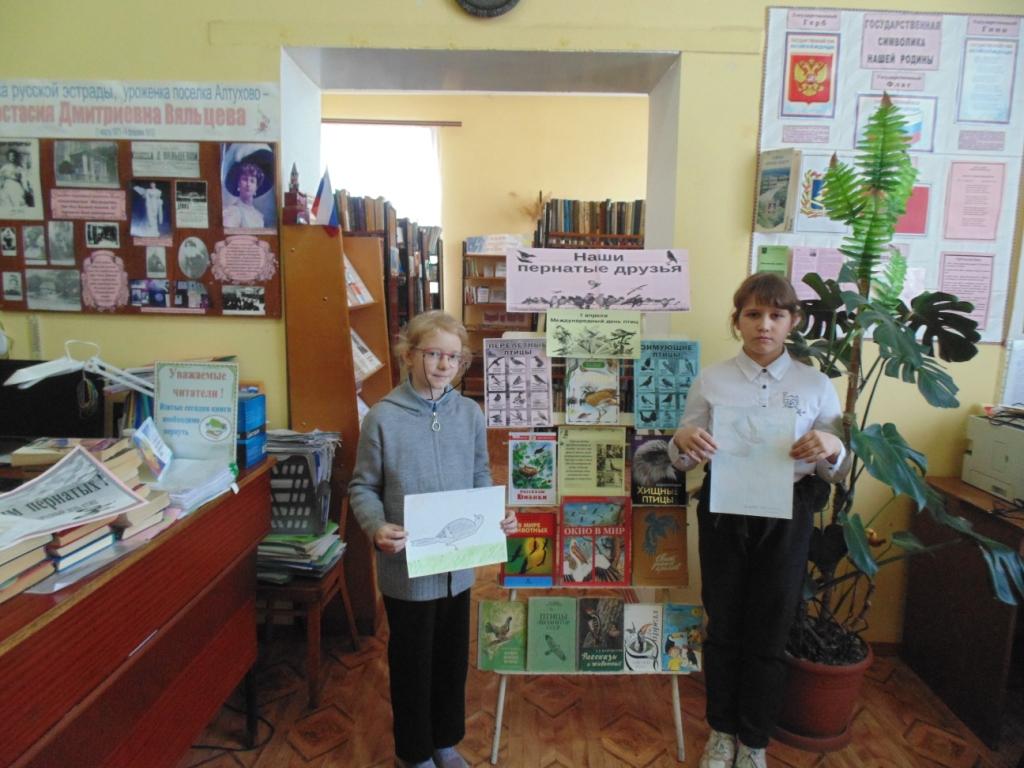 1 апреля отмечается Международный день птиц. В Алтуховской библиотеке совместно с Домом культуры была проведена викторина «Наши пернатые друзья». Ребята узнали, что дата проведения праздника была выбрана не случайно: как раз в это время из теплых краев возвращаются пернатые. Взрослые и дети в этот день благоустраивают места обитания водоплавающих птиц, вывешивают новые кормушки и скворечники. На Земле нет уголка, где не живут птицы. И в холодных ледяных пустынях Антарктики, и в песках Сахары, и над просторами океанов, и над вершинами самых высоких гор можно обнаружить пернатых. Птицы существуют на Земле более 150 миллионов лет. Ребята познакомились с литературой о птицах, отвечали на вопросы викторины, читали стихи о птицах и продемонстрировали свои рисунки.